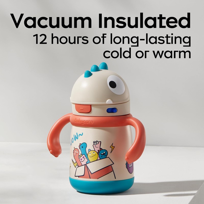 bc babycare Toby's Dinosaur Insulated Water Bottle Leak-Proof Vacuum, Toddler Water Bottle, Sippy Cups, Insulated Stainless Steel Water Bottle for Kids, 15-Hour Cold/warm Retention, Easy Sipping Valve