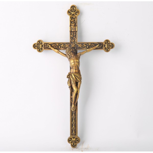 BC Crucifijo católico Jesús Crucifijo de pared, decoración religiosa del hogar, regalo de boda católica, aspecto tallado de metal, acabado dorado 12 pulgadas de alto, pintado a mano por Buildclassic