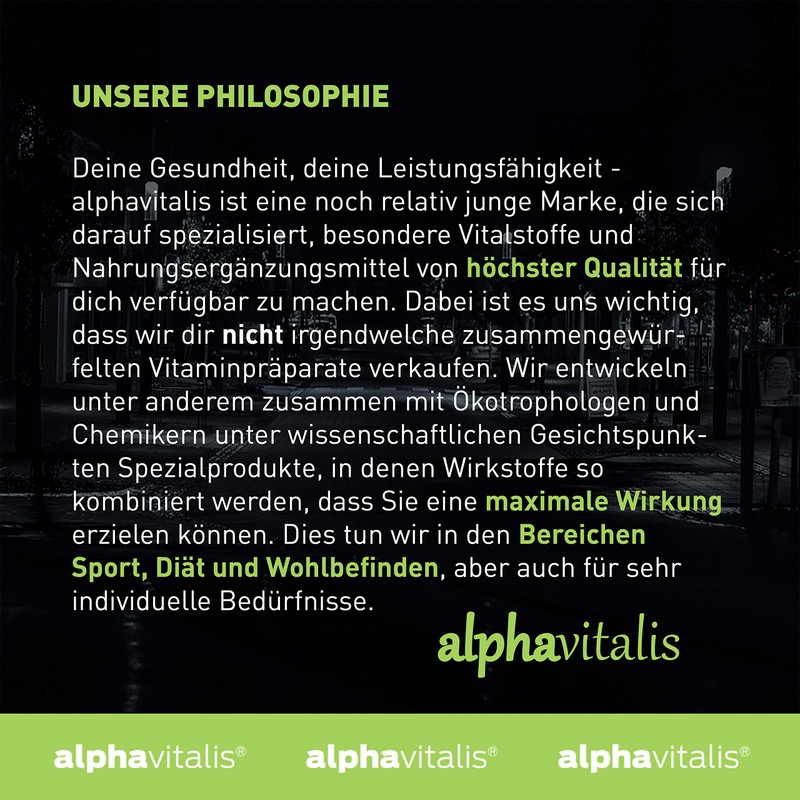 - 100% vegan - 100% quality - 0% unnecessary additives - 100% alphavitalis Sport