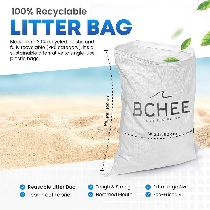 - | Litter Bag Sacks | Made from 30% recycled plastic. 100% recyclable. Reusable Bags. The BCHEE white sacks are tough, tear proof and can be used again and again. Forget about bin bags for litter picking (easily ripped, flap in the wind and are too small) instead use these light but super strong sacks. At 100cms high and 60cms wide, they are the perfect size. The bag of the mouth is hemmed which prevents fraying and makes opening easy. Made with tough 10x10 weave 800 denier fabric, these woven polypropylene sacks are the best quality.