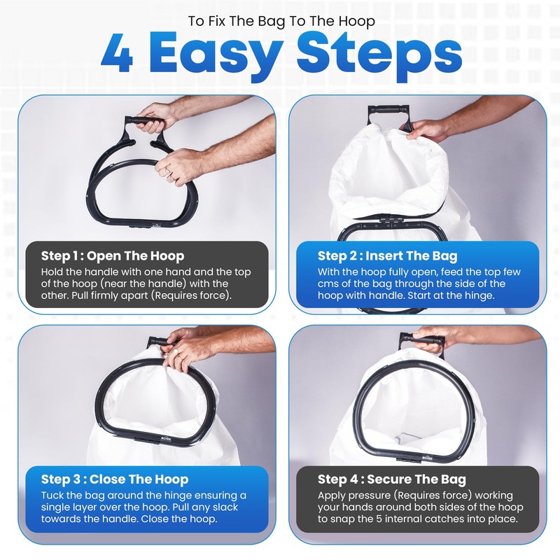 - | Instructions | Step 1: Open Hoop | Hold handle with one hand and top of the hoop (by handle) with the other. Pull firmly apart (Requires force) | Step 2: Insert Bag | With hoop open feed the top 2 cms of the bag through the handle side of the hoop. Start at the hinge | Step 3: Close Hoop | Tuck the bag around the hinge ensuring a single layer over the hoop. Pull any slack towards the handle. Close hoop | Step 4: Secure Bag | Apply pressure (Requires pressure) working your hands around both sides of the hoop to snap catches into place.