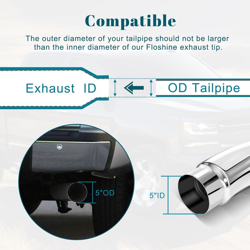 - Universal Fit: Seamlessly installs on ANY 5" OD exhaust (pickups/trucks/vans).