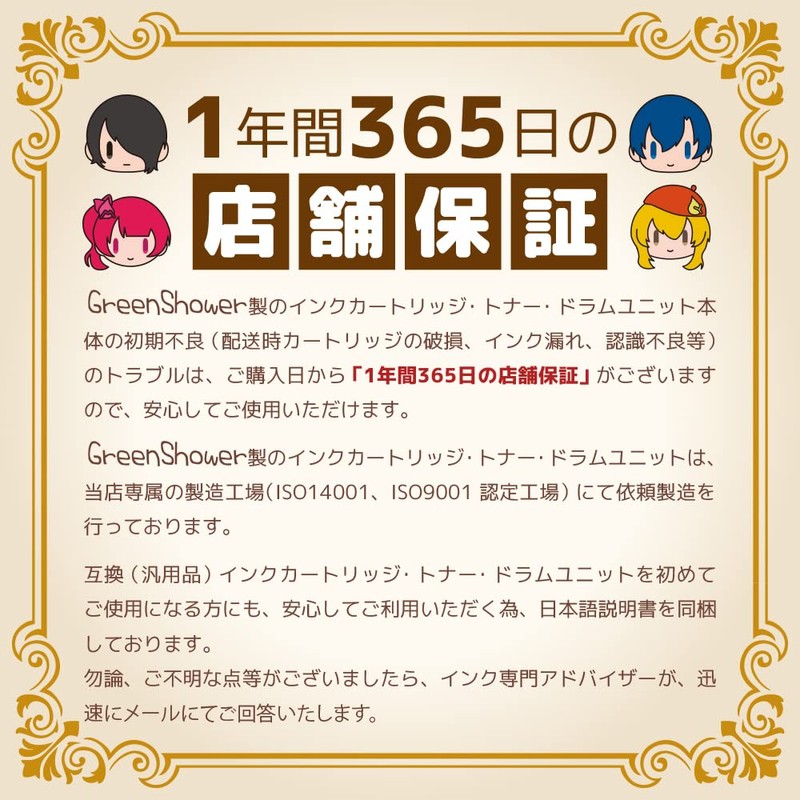 - ■Regarding product defects ■ This product is a genuine Green shower product made by Green Shower's factory direct and trademarked product. JAN and trademark rights acquired. Our store is packaged in a domestic factory and undergoes strict inspection before shipping to Amazon warehouse. However, if IC chip is defective, ink leakage, toner powder leakage, cartridge deformation, identification errors during installation, etc. is covered with a [Peace of mind] store warranty for money back and replacement. In case of refund, we will refund the product price as a general rule. Please contact Green Shower directly. There are reports that products sold by other sellers other than Green Shower's may differ in specifications. [Safe One Year Pack] Please be careful when making your purchase. Email will be delivered in 24 hours. Answers will be within business hours. If you have any questions in English/Chinese, we may take time to answer