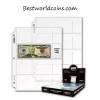 These pages are premium pages made by BCW. They hold 4 (2 5/8'' x 6 1/8'') currency bills per page and have a 1 1/2'' x 2 3/4'' window for a label. These pages are heavier and clearer than other brands of pages. This listing is for 5 pages, with total capacity of 20 bills. These pages are great for holding photos, cards or other memorabilia. Great for displaying US Dollars.
