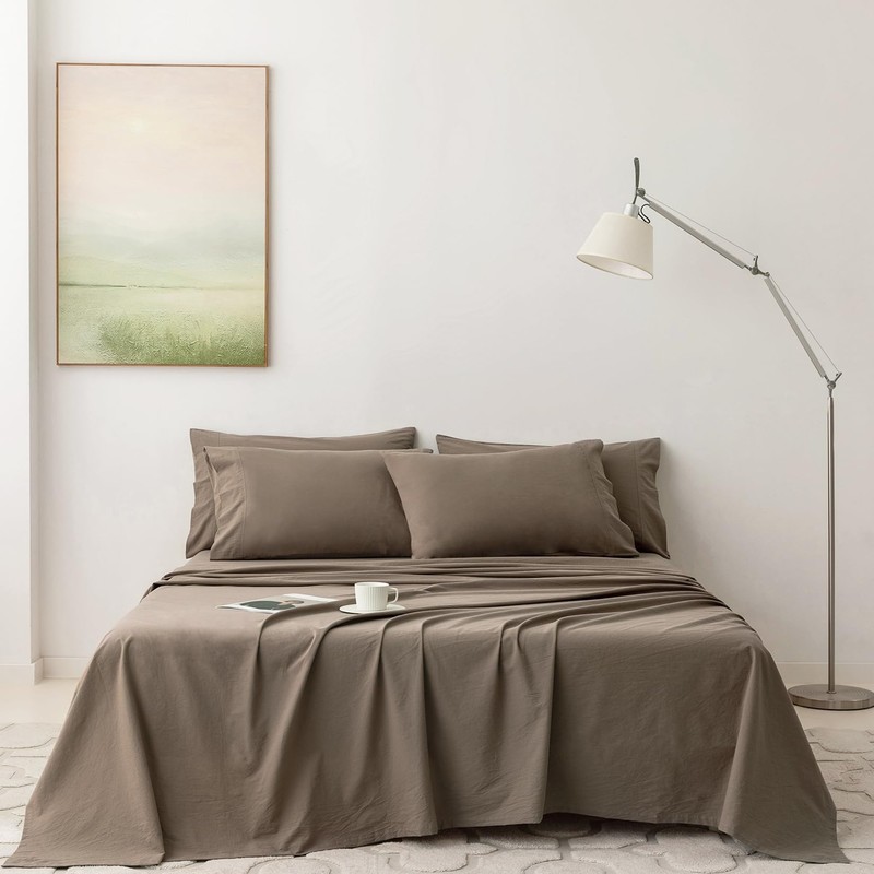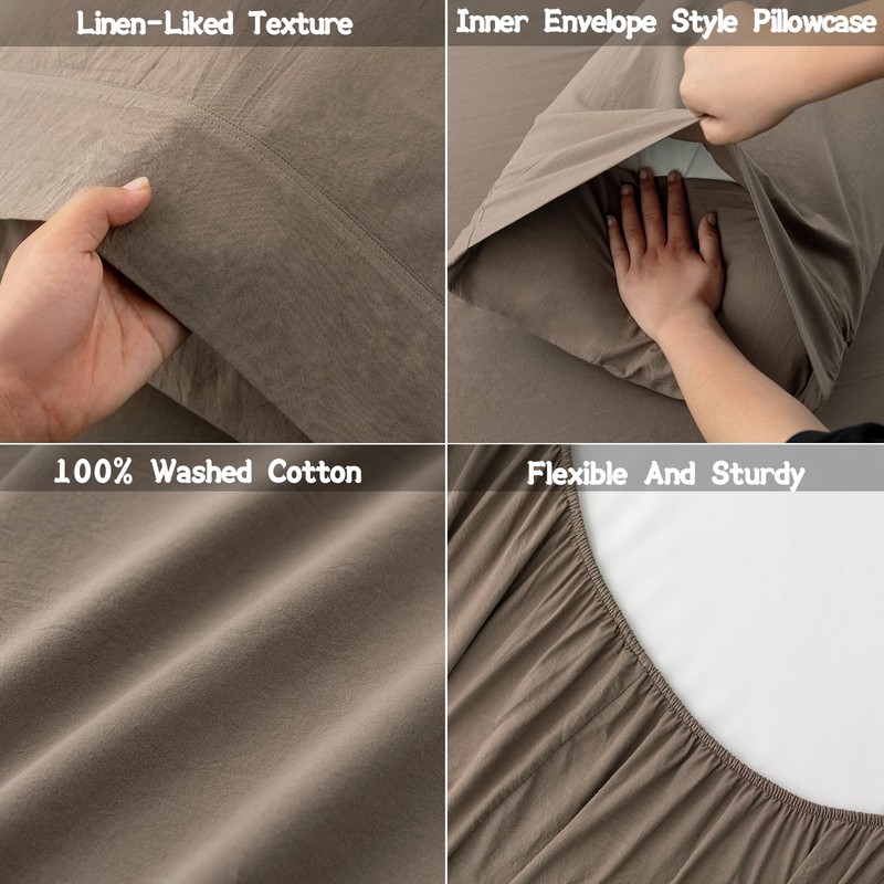 - Pure Cotton Brings More Comfortable: This light brown linen feel sheet bedding set is made of 100% washed cotton, compared with other flat sheet and fitted sheet made of polyester fiber is more breathable and more skin-friendly, not easy to static electricity.