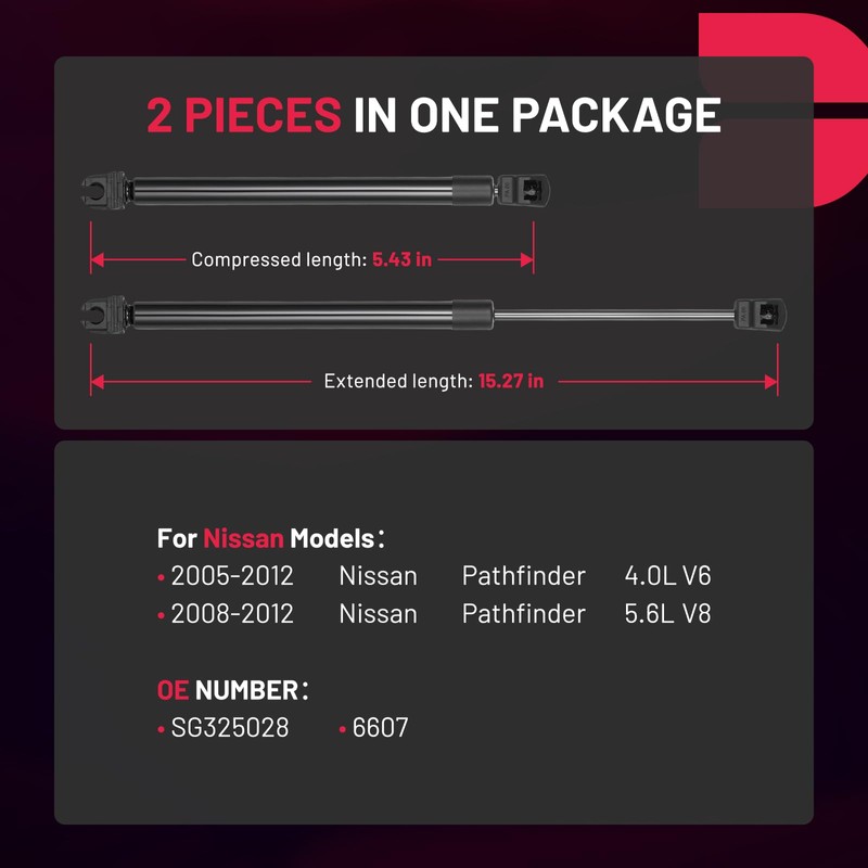 • 【Basic Info.】BDFHYK Rear Window Glass Lift Supports Shock Struts Gas Spring Compatible with Nissan Pathfinder 2005-2012 4.0L 5.6L. Please see specifications at detail page.It has 2 items in one set and is installed at Rear Window Glass. Rear Window Glass struts are 5.43 in compressed and 15.27 in extended.No ball studs. 12+6 months warrany.