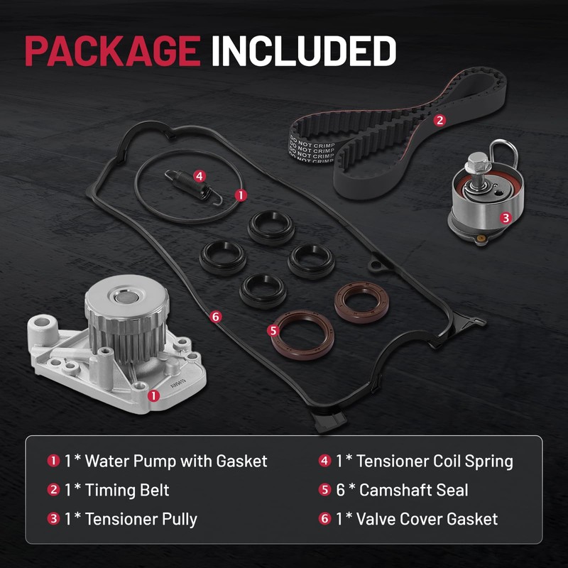- [PACKAGE INCLUDES]: 1 x Water Pump with Gasket, 1 x Timing Belt, 1 x Timing Belt Tensioner Pulley, 1 x Tensioner Coil Spring, 6 x Camshaft Seals, 1 x Valve Cover Gasket