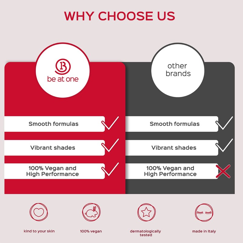 - BE AT ONE Vegan makeup: we believe in educating consumers about identifying harmful ingredients. Most cosmetics on the market are used on animals, and many products still contain ingredients derived from either animals or insects. Animal by-products are not only wrong from an ethical point of view, but can also create a lot of skin sensitivity and irritation. We believe this must stop. That's why we developed cosmetics that are non-comedogenic, 100% vegan, paraben and cruelty free.