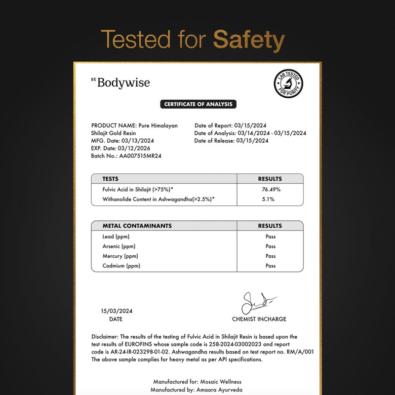 • LAB TESTED & PREMIUM QUALITY: Be Bodywise Pure Himalayan Shilajit Resin Gold Gummy is Lab Tested to be free from heavy metals, fillers, and harmful additives. Crafted in its most authentic form, it has no added sugar, corn starch, glucose syrup, artificial colours, or gum. It's completely vegan, natural, and non-GMO.