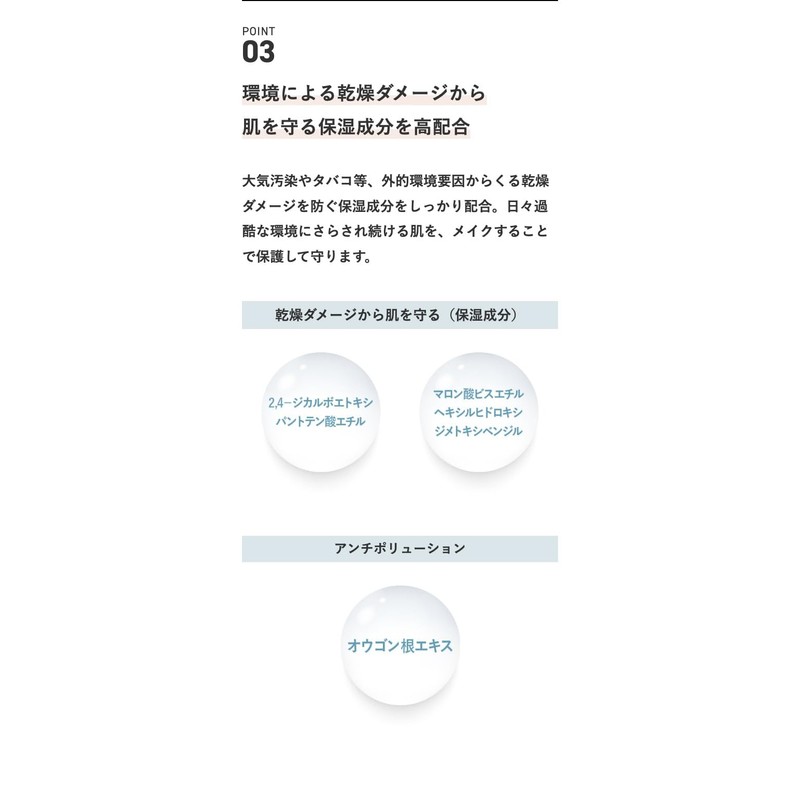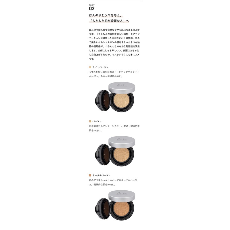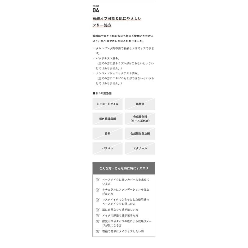 • (Especially recommended for those who are looking for a high coverage base makeup; For those who want to finish the foundation naturally; For those looking for a base makeup that feels smooth and smooth on their mask; For those who want a natural sheen on your skin; For those who don't like the thickest application of makeup; For those concerned about drying damage caused by exhaust gas or cigarette smokes; For those who want to easily remove makeup easily