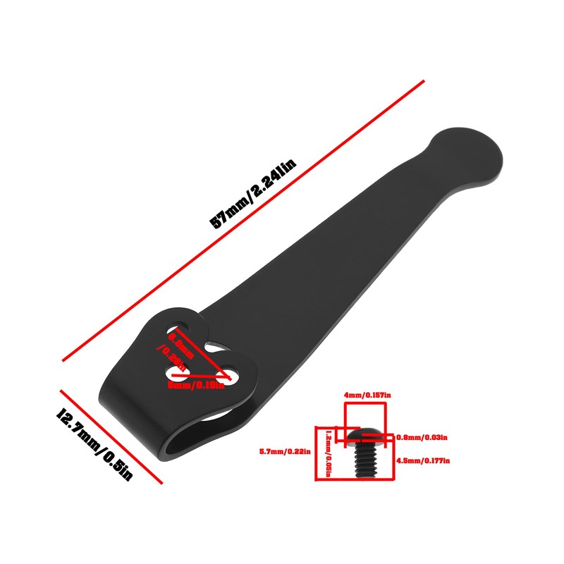 - Product size: the pocket clips are 57 mm long, 12.7 mm wide, with a hole spacing of 6.8 mm or 5 mm; the screw size is 5.7 mm length, thread length 4.5 mm, head diameter 4 mm, thread 2-56UNC. Manual measurement, please allow slight errors.
