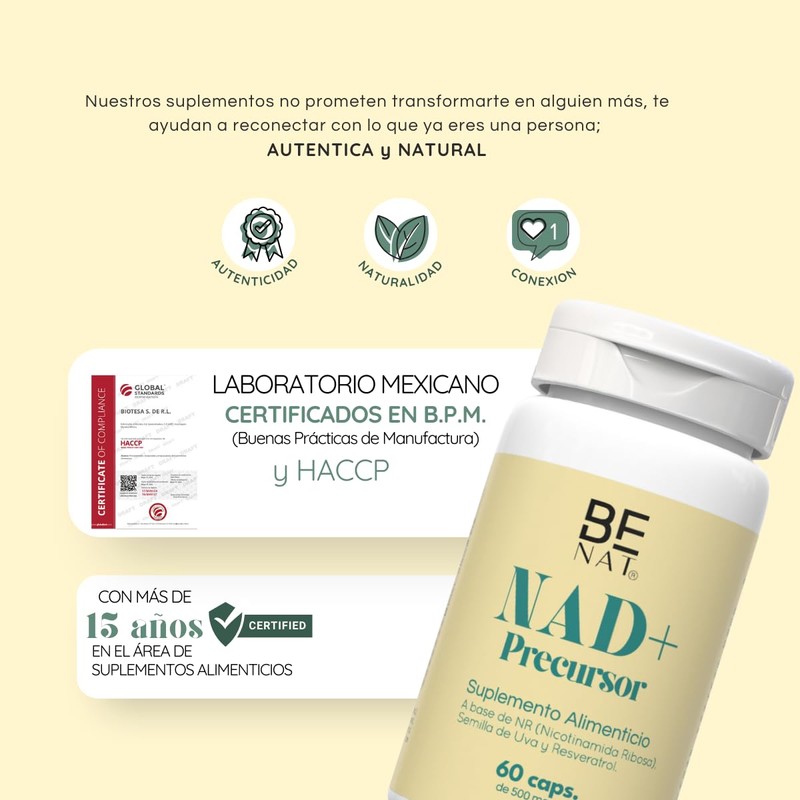 BE NAT | NAD+ Precursor| NR Nicotinamida Ribosa potenciado con Resveratrol, Quercetina, Coenzima Q10, Semilla de Uva y Granada, Suplemento alimenticio en cápsulas | 30 días de consumo, 60 cápsulas 500 mg c/u