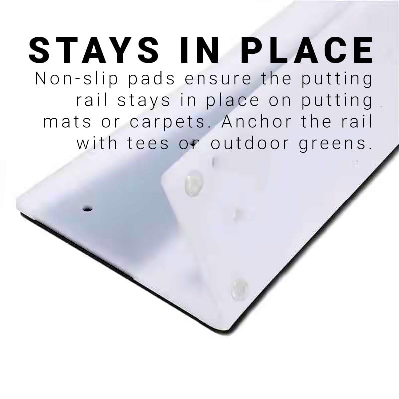- WORKS ON ANY SURFACE: Use it on indoor putting mats, outdoor greens, or even your living room carpet to sharpen your putting game anytime. Non-slip pads keep the Putting Rail in place on slick surfaces such as indoor putting mats or carpeting.