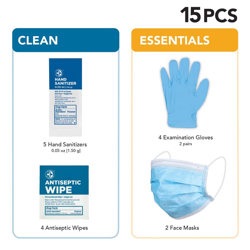 • WHAT’S INCLUDED - Includes hand sanitizers, wipes, masks, and gloves.