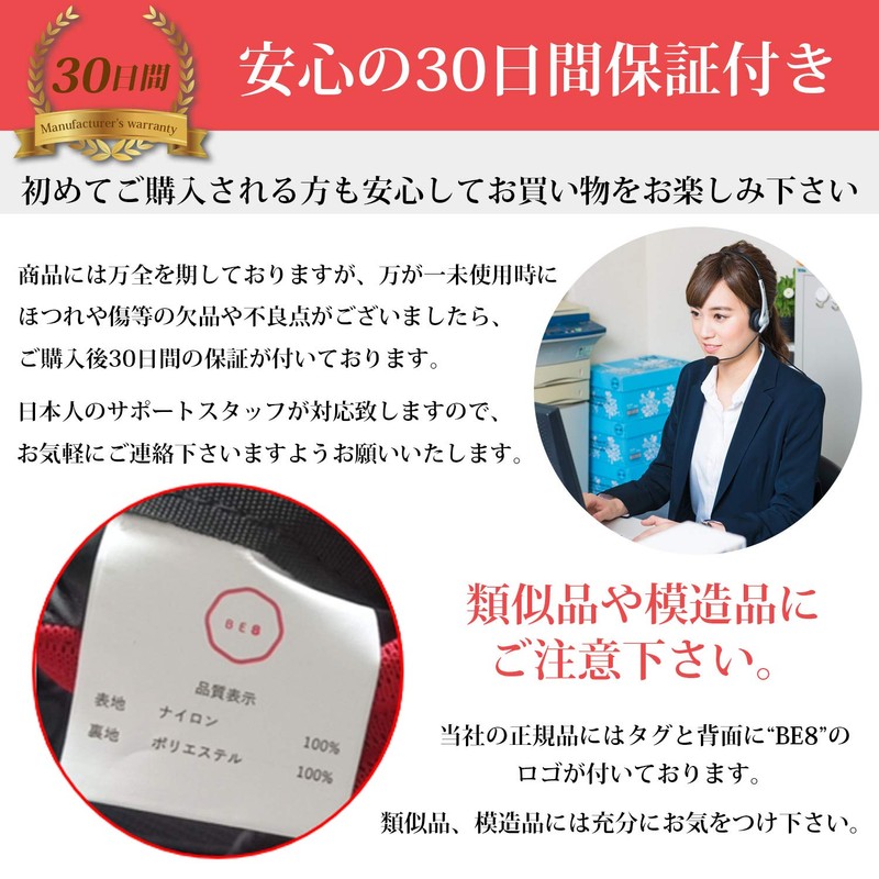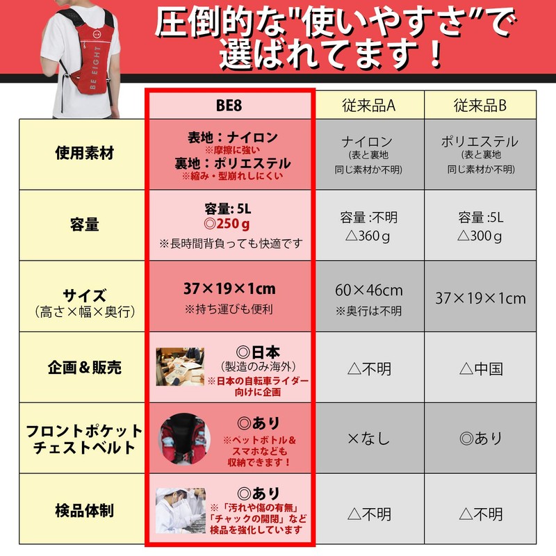 • Planned and sold by a Japanese Company & thorough inspection System: BE8 products are designed and sold in Japan and are developed for Japanese riders and runners. In addition, the inspection system has been strengthened such as dirt and scratches, opening and closing the zipper, and working with thread threads
