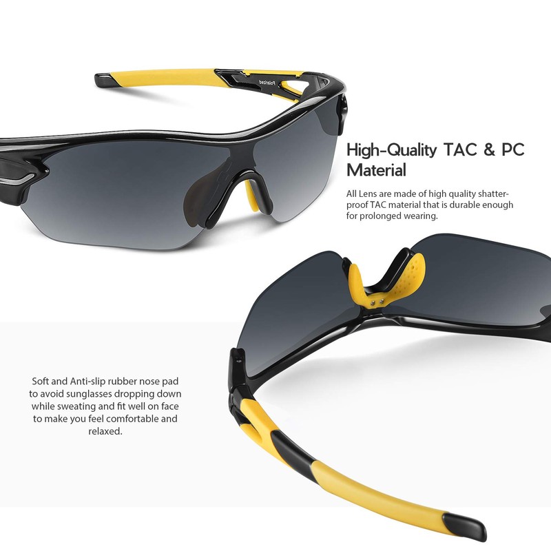 - 【SOFT ANTI-SLIP RUBBER NOSE PAD 】- Soft and Anti-slip rubber nose pad to avoid sunglasses dropping down while sweating and fit well on the face. Make your nose feel comfortable while wearing these polarized sports sunglasses for cycling running fishing golf and many sports.
