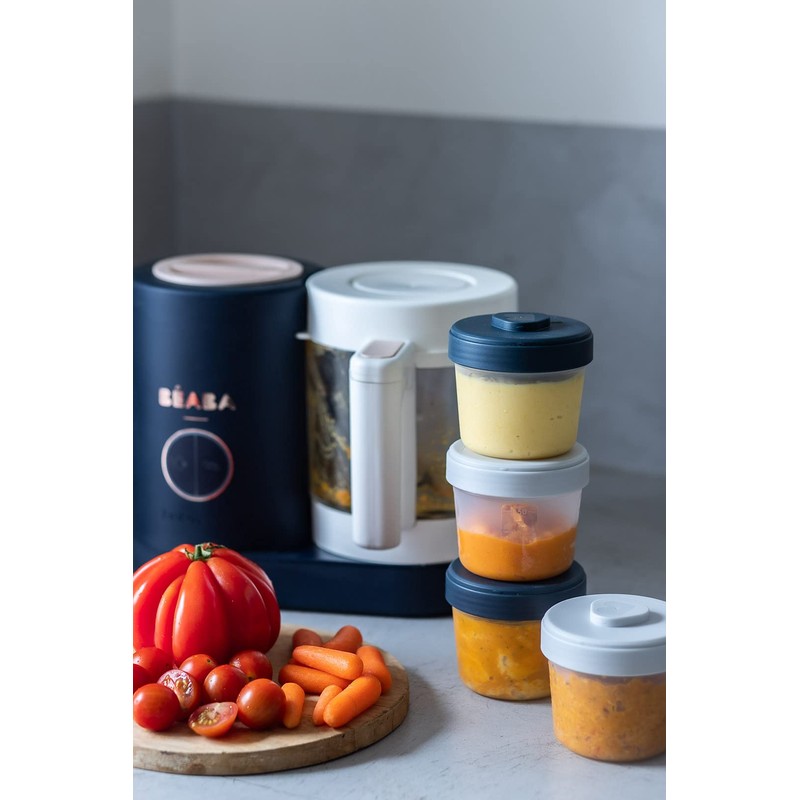 Beaba Set of 4 Storage Pots, Interlocking, Stackable and Linkable pots, 100% Airtight, Measuring Gauge, Freezable, Breastmilk Storage, 4x150ml, Grey/Blue