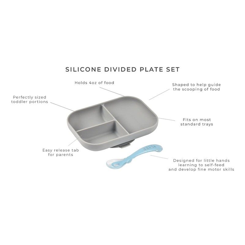 - 1ST & 2ND STAGES: Great as a baby plate or toddler plate. Made from 100% food grade silicone, bowl for baby is incredibly soft yet unbreakable, ensuring long-lasting use. The flexibility of silicone allows for easy handling & minimizes the risk of spills. The divided baby suction plate is perfect for picky eaters who don't like their food to touch. Vertical sides allow for easier scooping, helping little one get food on their spoon! 2nd stage silicone spoon is designed for little hands learning to self-feed but also soft & supple on the gums.