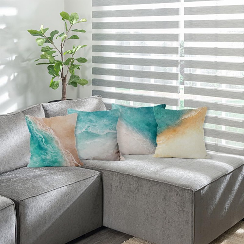 Beach Pillow Covers 18x18 Inch, Teal Ocean Throw Pillow Covers Summer Decorative Linen Cushion Cases for Sofa Couch Car, Set of 4 (No Inserts)