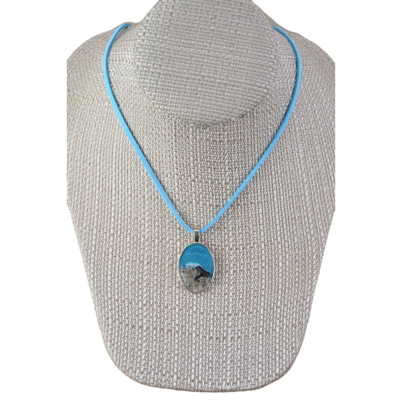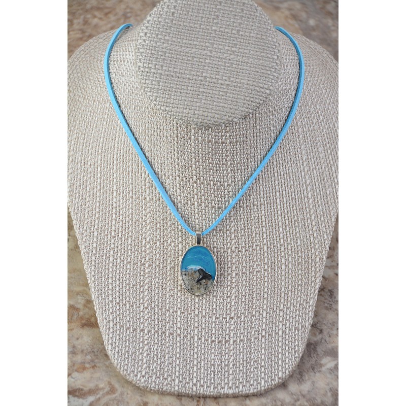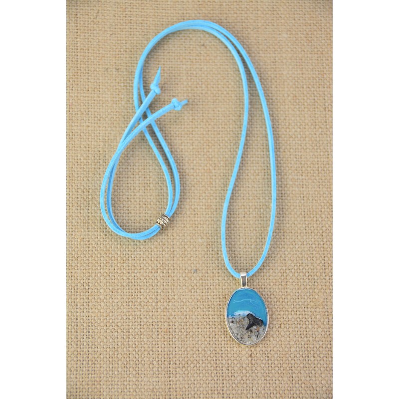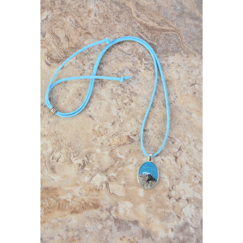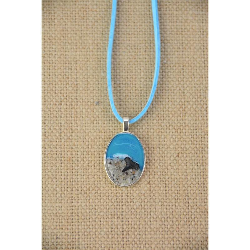 This cool necklace is made with real beach sand, and is painted to look like the ocean! It has a micro lemon shark tooth on the beach, and is topped with a coat of clear resin. Pendant measures 3/4" wide x 1.25" tall. Bright blue vegan faux suede adjusts from 14-28" by sliding the silver bead at the back. Item# NG6574 Beach sand is a mixture of sand collected by the artists, from Sanibel Island, Florida & Manasota beach in Venice, Florida. Shark tooth was found in the Peace River by the artists.