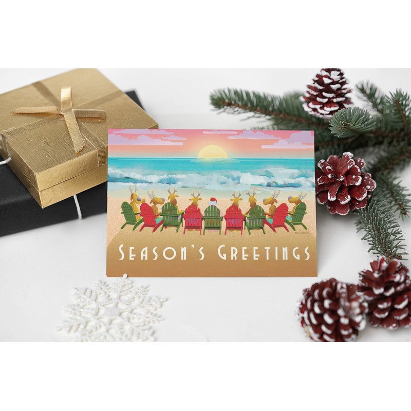 - Santa and the reindeer enjoy a beautiful beach sunsent in these cute beach scene Christmas cards.