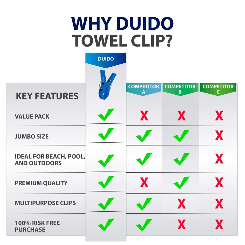 - DURABLE & THICK PLASTIC CLAMP – Duido’s jumbo size plastic clips can be used to prevent even the heaviest of towels, blankets or quilts from blowing away; These thick extra-large clips are designed to handle more than the usual wear and tear; We ensure our quilt clips will last you a long time