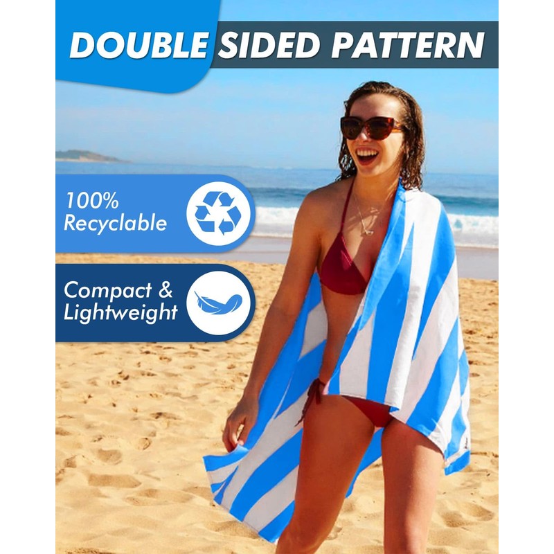 Maximize Beach Bag Space!  Our innovative built-in rubber band simplifies rolling ultrafine fiber towels into compact sizes. Once compressed, they shrink to just a few inches, optimizing space in your travel bag.  Eco-friendly Beach Towels!  Opt for towels crafted from 100% recyclable microfibers to elevate your beach experience sustainably.  Ultimate Travel Companion!  With ultrafine fibers, our towels boast rapid drying capabilities. Despite their quick-drying nature, they excel in water absorption, soaking up three times their weight. Say goodbye to dampness as they swiftly dry both you and your hair.