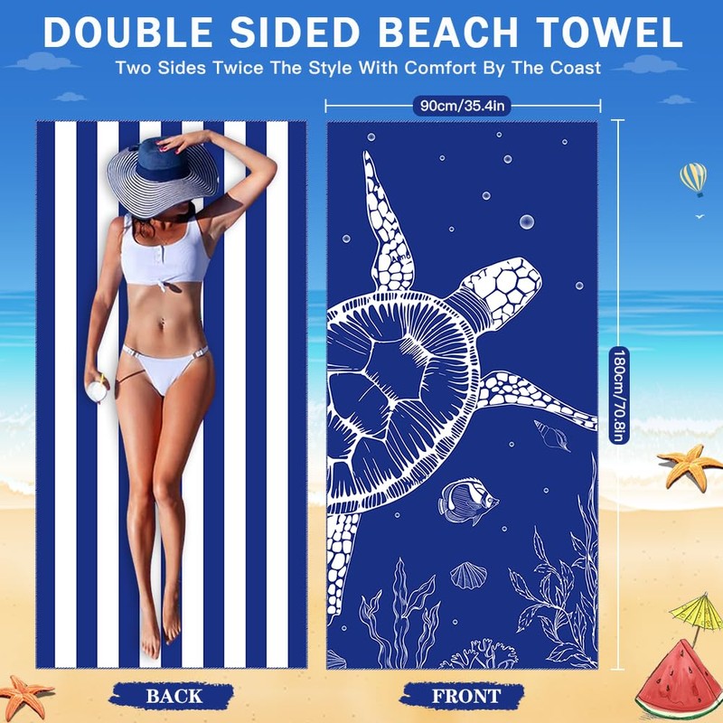 - 【Double-Sided Comfort for Adults】Measuring 180cm x 90cm (71"x36"), this large beach towel provides ample coverage for adults. Featuring double-sided designs (vibrant patterns on one side, chic stripes on the other), it avoids the dullness of single-sided towels while adding elegance. Perfect for beach or poolside lounging, making you stand out effortlessly