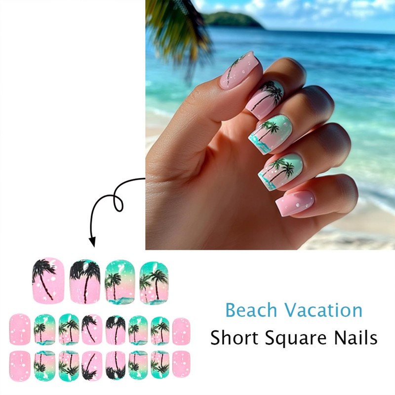 Beach Vacation Press on Nails Coconut Tree Design Fake Nails with Glue Short Square Full Cover Stick on Nail for Women Glossy Artificial False Nail