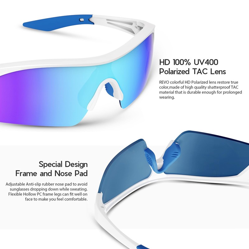 - REVO COLORFUL HD POLARIZED 100% UV400 LENS: UV400 lens block 100% harmful UVA & UVB Rays. REVO colorful HD Polarized lens restore true color, with high-density Revo coating, keeping the original color, improve visual clarity and contrast effectively. Easier eliminate reflected and scattered light,make the scenery more clear and soft and protect eyes perfectly