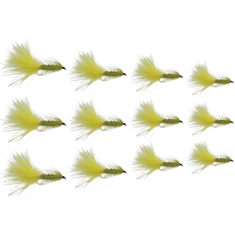 Bead Head Wooly Bugger Fly Fishing Flies for Trout and Other Freshwater Fish - One Dozen Wet Flies - 4 Size Assortment 6, 8, 10, 12 (3 of Each Size)/Hand Tied (Olive and Yellow)