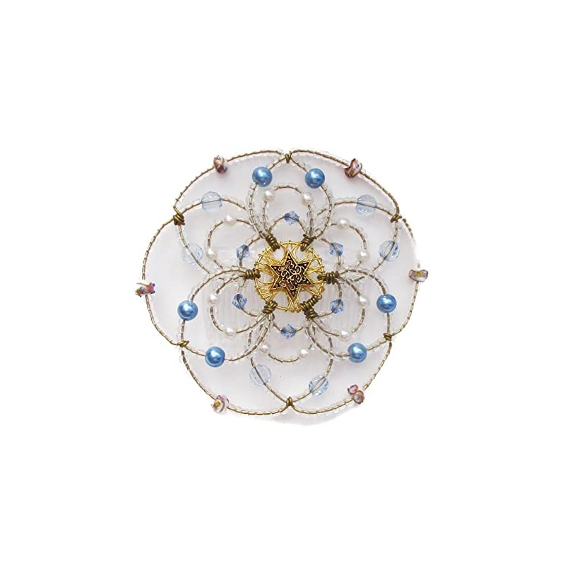 This kippah was hand-crafted. It measures 4 1/2 inches across and comes with a clear comb attached to the back.