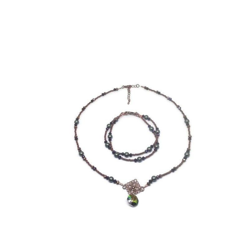 Beaded Necklace and 2 Strand Twisted Bracelet Set with Green Austrian crystal Pearls and Purple Crystals.