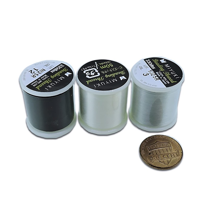 Miyuki beading thread is a multi-strand twisted nylon thread that is specially coated. This coating means that the thread doesn't require conditioning, making it a very popular thread. It's the perfect thread for delicate projects and small-hole beads like seed beads. This fine yet strong beading thread is perfect for techniques that require multiple passes through beads, like brick stitch, peyote, loom work, and more. You'll love this tangle and fray-resistant thread, as it's easy to work with and easily threads onto a beading needle. 3 Spools of Miyuki Beading Thread 50 meters (54.6 yards) per spool. Diameter: 330 DTEX / 0.203mm / 0.012". Made in the Japan Colors: White, Black and Silver