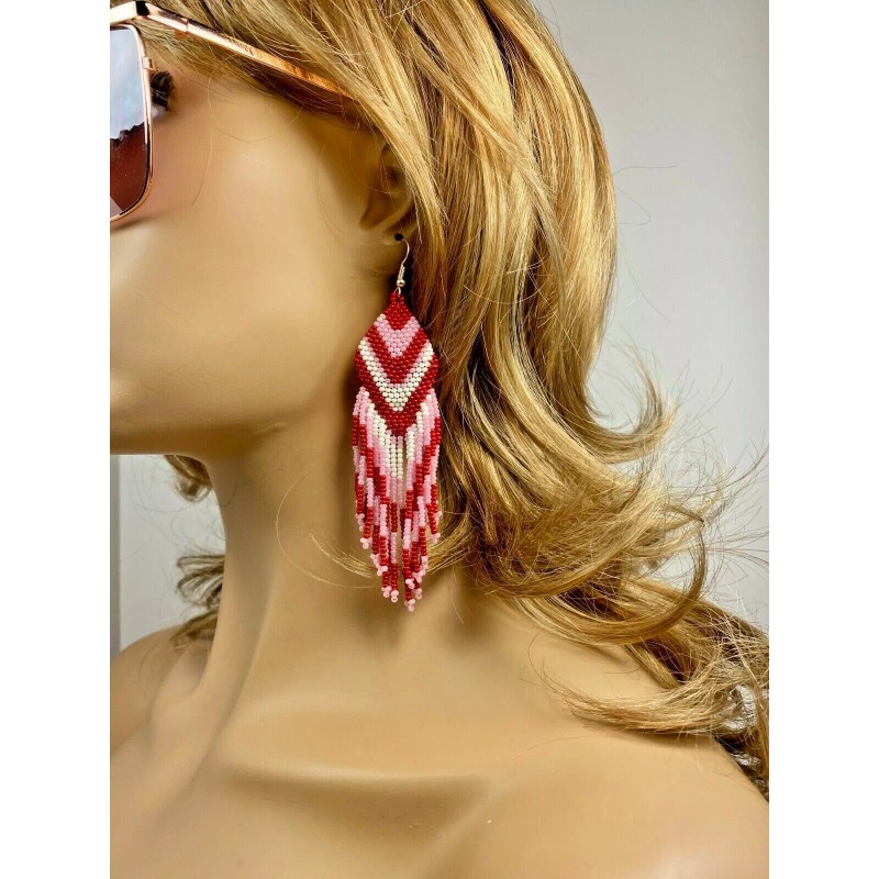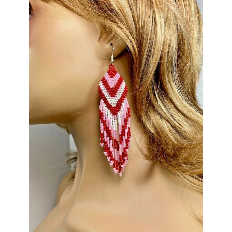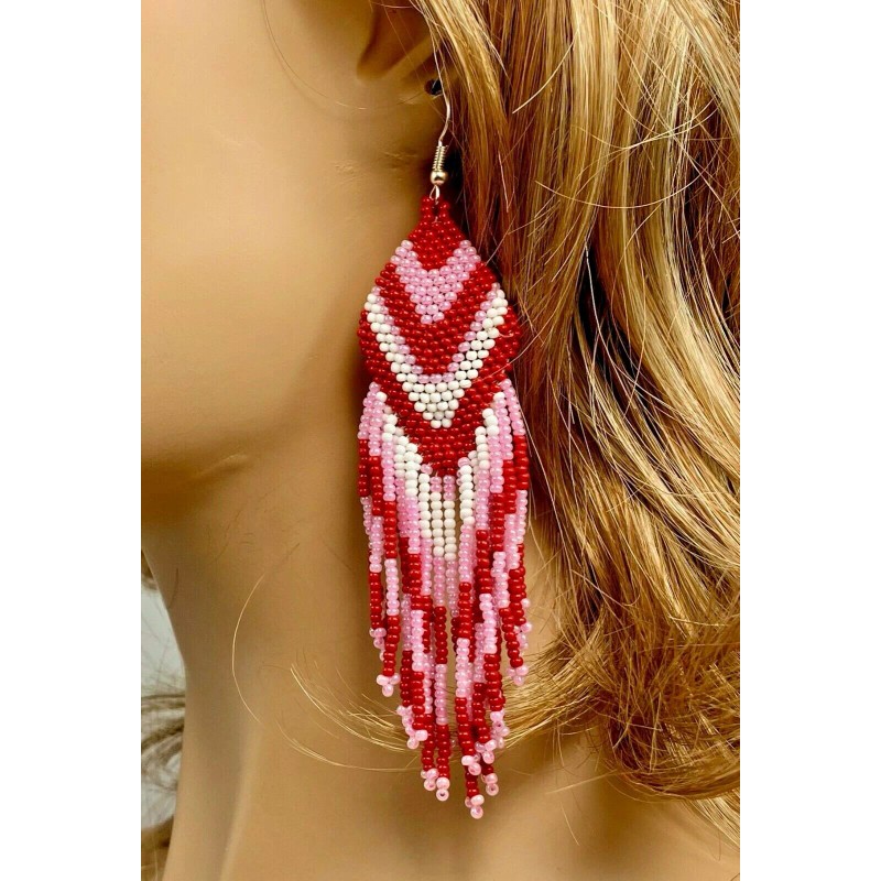 BeadsCorner NATIVE STYLE ETHNIC RED PINK SEED BEADED HANDMADE CHANDELIER EARR...