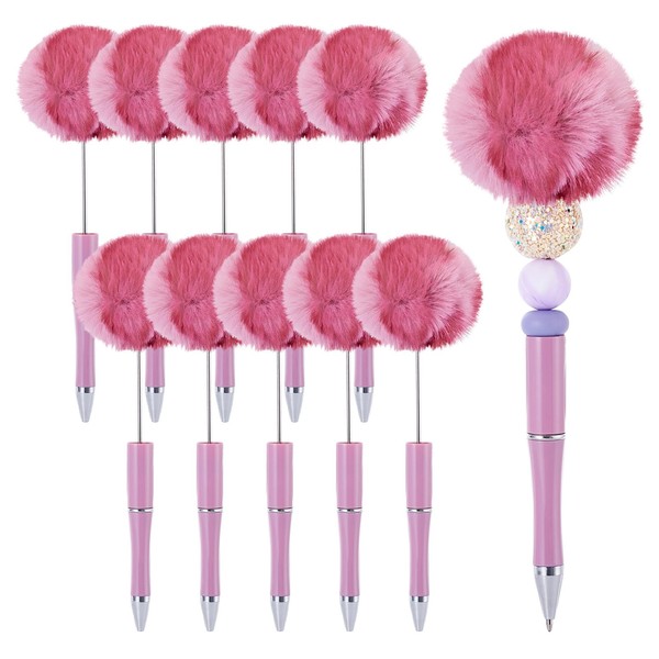 Beadthoven 10pcs Fluffy Beadable Pens, DIY Pom Pom Plastic Beaded Pens, Animal Leopard Printed Plush Ball Fuzzy Pens Shaft Black Ink Ballpoint Pens for School Office Student Gift Supplies Pink