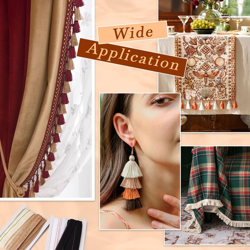 - Multi Uses: decorative trim is perfect for DIY sewing, clothes knitting and craft projects, easily embellish your home with these beautiful fringe trim on curtains, pillows, bedspreads, cushion covers, shower curtains, bag, junk journals, lamp shades, Christmas tree ornaments. Also ideal for adding a decorative touch to clothing and costumes, including dresses, Latin dance skirts, and traditional attire.