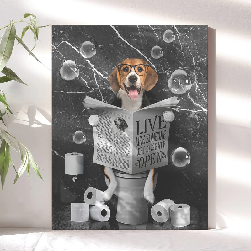 Beagle Dog Sitting in Toilet Bathroom Decor Wall Art Funny Beagle Pictures Black and White Bathroom Wall Decor Farmhouse Dogs Painting for Toilet Bathroom Animals Artwork Framed 16"x20"