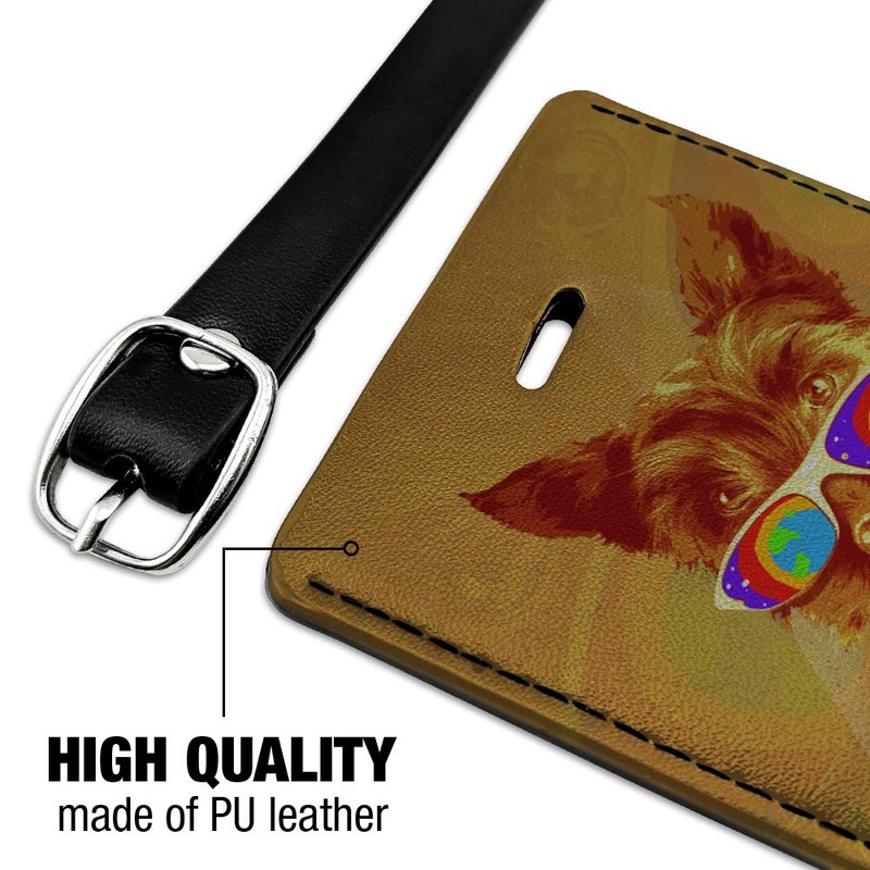- A TRAVEL MUST HAVE: Set your suitcases apart in style. Featuring a leather strap with buckle and clear slip pocket, our eye-catching luggage tag is easy to spot, making finding it a snap. Printed with vibrant, long-lasting UV and water-resistant inks means no fading or smearing.