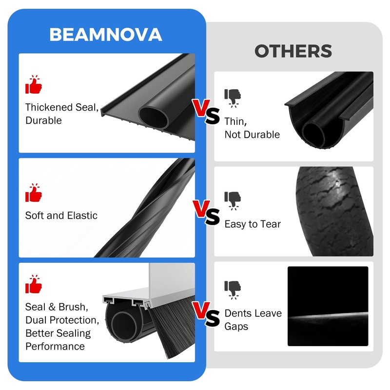 - **Durable Construction**: The BEAMNOVA garage door seal kit features a robust aluminum track holder, plastic brush strips, and natural rubber. The aluminum base is rust-resistant, while the soft-textured brush and rubber effectively block dust, rain, and snow. All materials are designed to withstand temperatures from -40°F to 140°F.