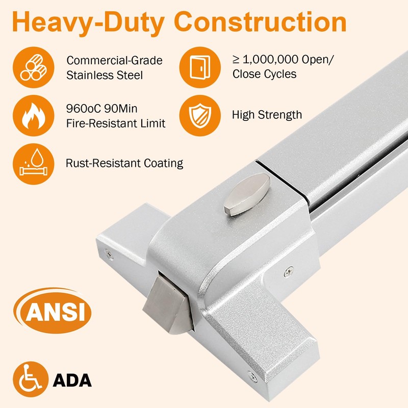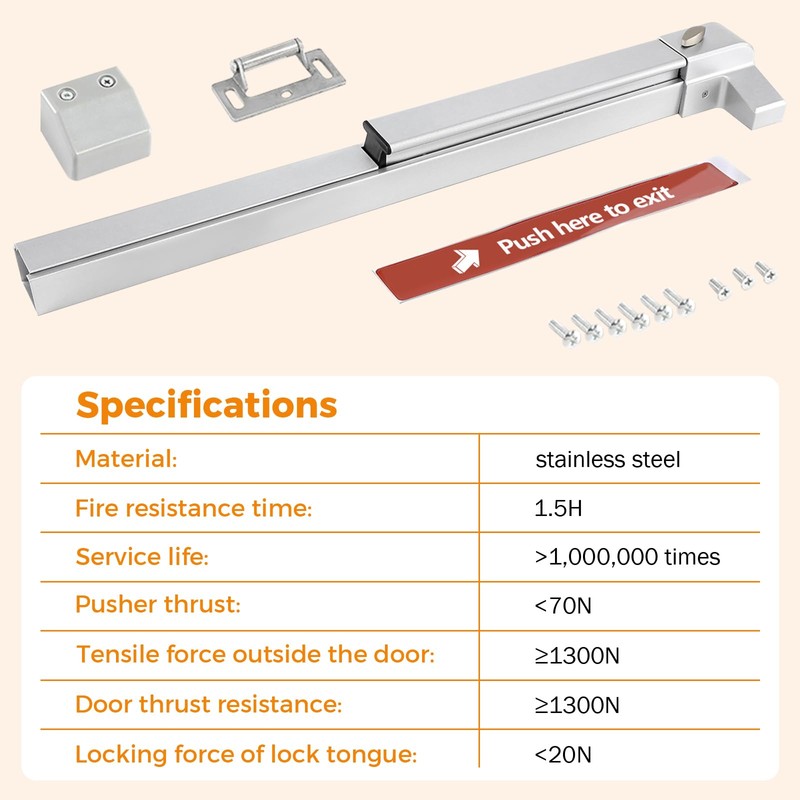 • **High Compatibility**: BEAMNOVA stainless steel door panic bar exit device is highly compatible and can be used on wood, metal, or composite doors. It fits doors from 27.5 to 41 inches wide but is not suitable for glass doors. The door bar can be cut to fit on narrower doors.