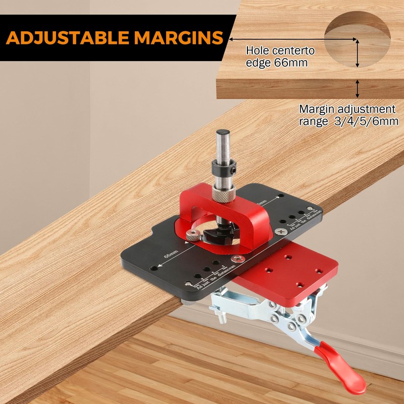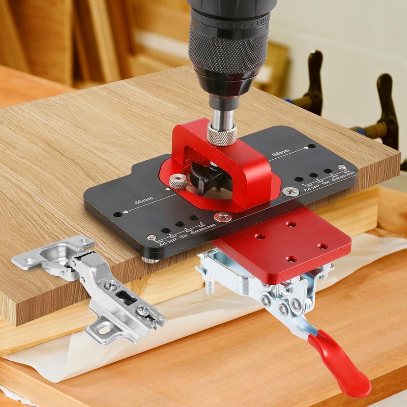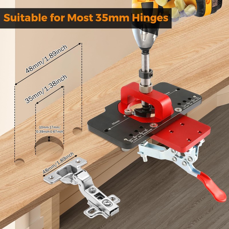 - 【Easy to Operate】Using the 35mm hinged drilling jig, drilling is very simple. Adjustable dials with 3mm, 4mm, 5mm and 6mm hinge offsets allow you to easily choose where to drill. Use the drill to attach the drill for an easy and fast drilling experience. Finally, auxiliary positioning holes on both sides allow screws to be easily screwed into the plank.
