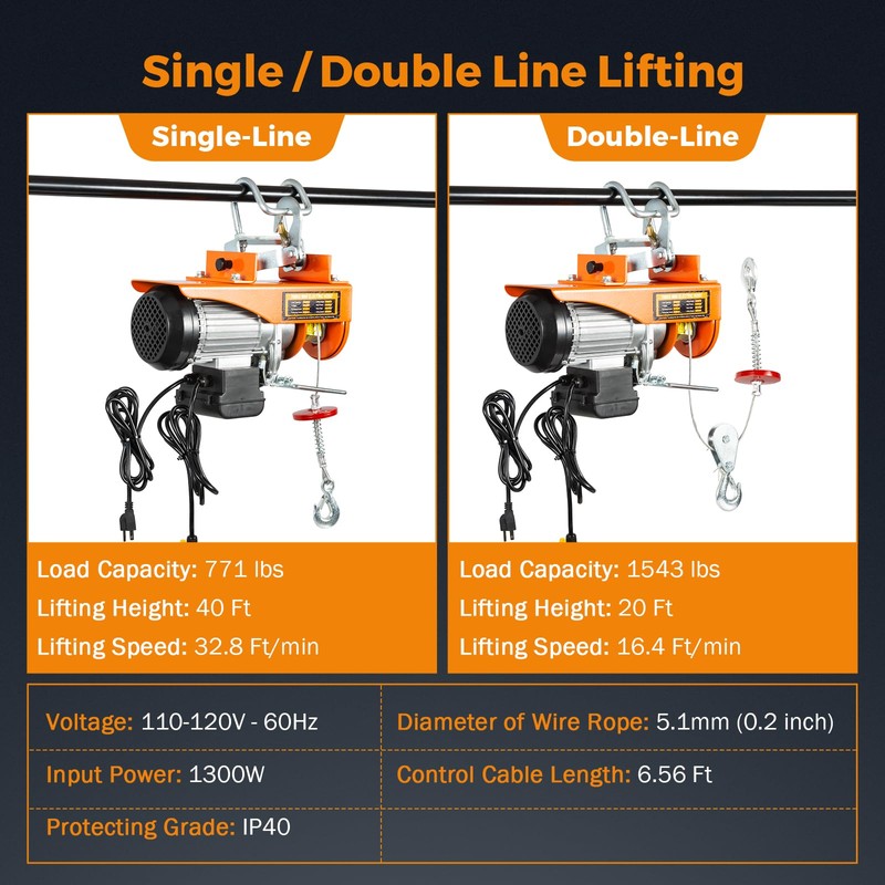 - BEAMNOVA 1543lbs electric hoist can be used for single line or double line lifting. The load capacity of single line lifting is twice as much as double line lifting, and the speed of single line lifting is 1/2 of double line lifting.