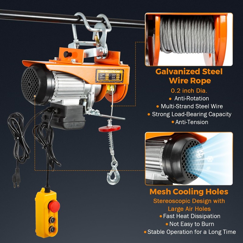- HIGH HEAT DISSIPATION PERFORMANCE - The copper-core motor inside the electric hoist has good thermal and electrical conductivity, low voltage loss, high motor force, and low heat production. The built-in cooling fan improves heat dissipation.
