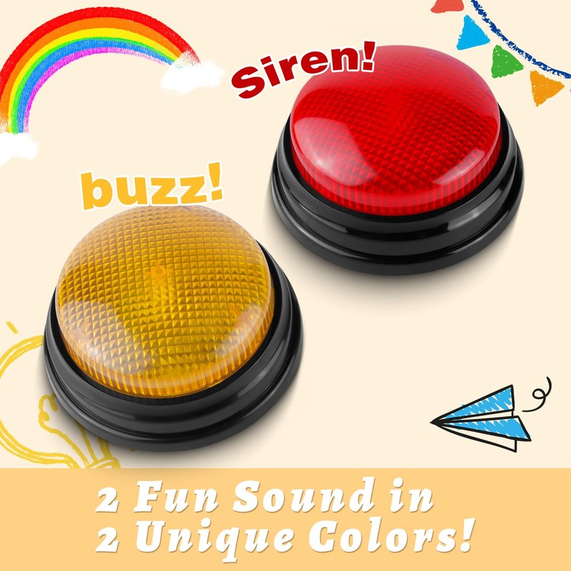 • INTERACTIVE FUN: Contains 2 colorful buzzers (red, yellow), perfect for family activities and group games. Each buzzer lights up and makes a unique sound (Buzz,Siren), adding fun and clear identification to each player's answer.