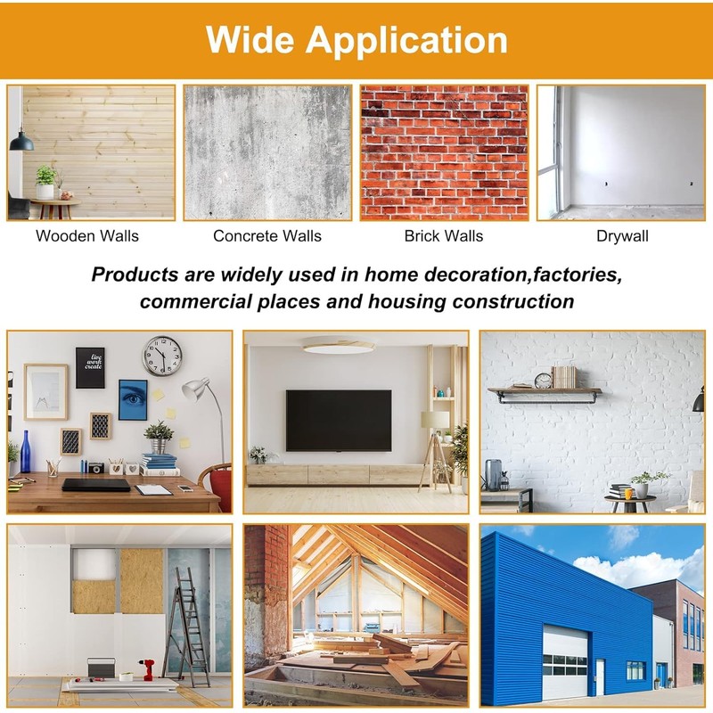 The plastic expansion tube plugs and the self tapping screw are well matched, easy to install. Ideal for concrete walls, solid bricks, plasterboard, wooden walls, and other various wall surfaces. Suitable for fixing curtains, lamps, mirrors, photo frames, decorative pictures, shelves, towel racks, TV brackets, etc.