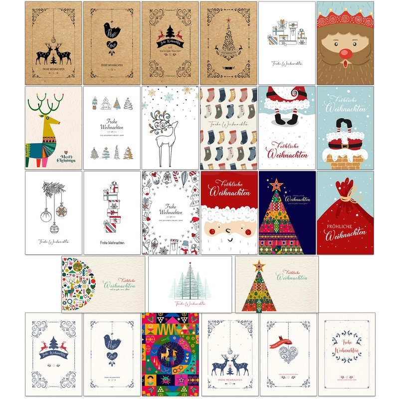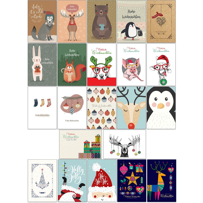 - 100 Christmas photo cards, each with a different photo on the front. A wide range of different Christmas postcards and designs. 100 assorted designs.