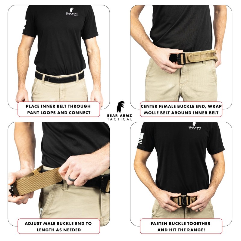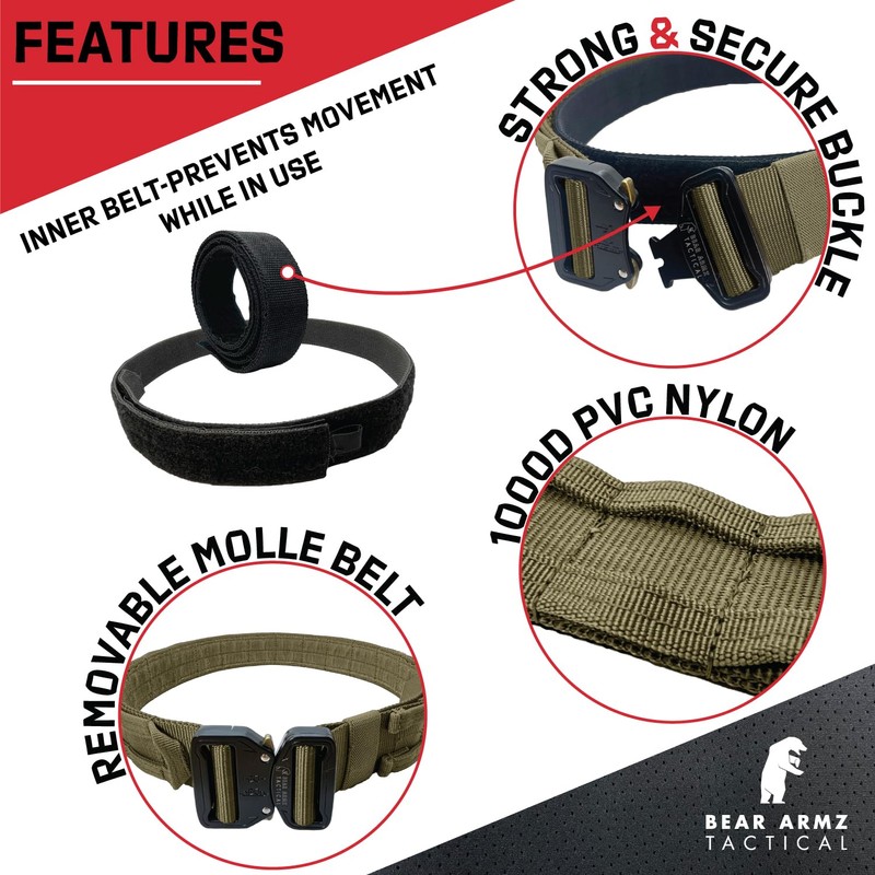 - STRONG: Our belt is made with 1000D PVC Nylon and a high-quality quick release metal buckle. All designed to hold up to 100 pounds of combat gear including guns, magazines, med kits, flashlights, and all molle attachments.