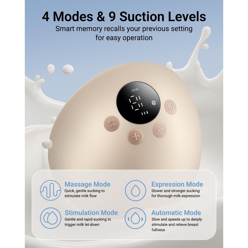 - Moms Pumping Customize Setting: Enjoy tailor-made comfort with 4 Modes(Massage, Expression, Stimulation, Automatic Mode) and 9 adjustable suction levels. Smart display the current battery power, working time, mode and suction level, clear at a glance and easy operation. Bear hands free breast pump closely replicating a baby’s natural nursing rhythm, lets you nurse comfortably