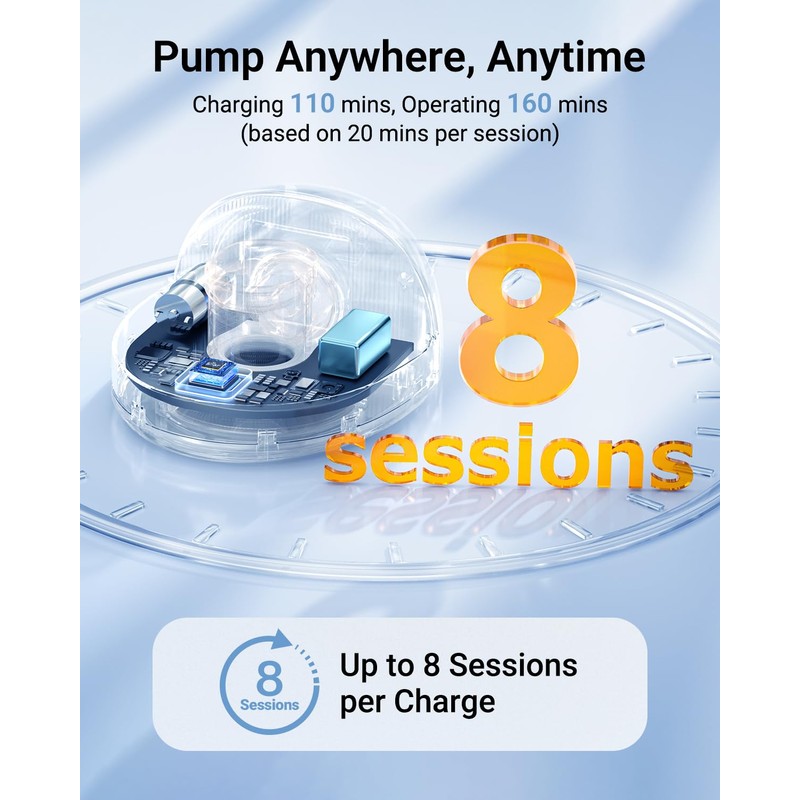 - One Charge for All Day Pumping: Wireless breast pump built-in rechargeable 1300mAh long-battery-life delivers powerful suction, supports 8 sessions pumping, 20-minute auto shut off per session for peace of mind and safety
